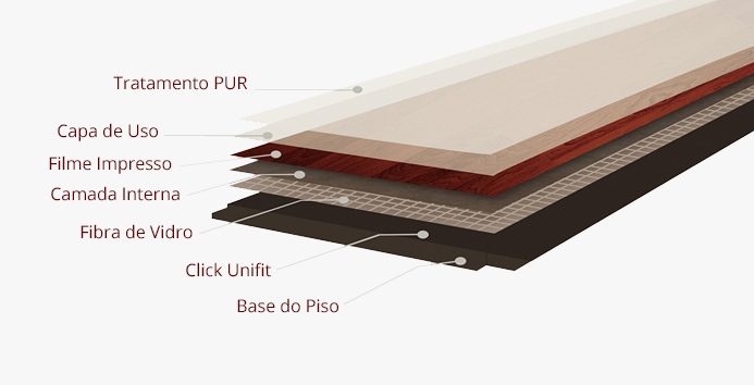 O Piso Vinílico é um material emborrachado composto de várias camadas, desde a base do piso, a fibra de vidro e a capa de uso, além dos componentes que estruturam o piso e as de proteção.